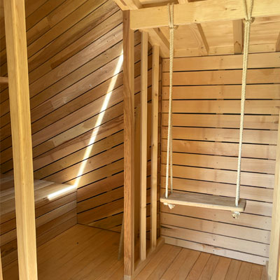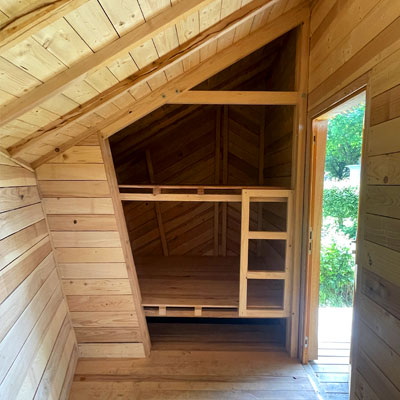 La classe terminale de l'École Nationale Supérieure des Technologies et Industries du Bois a créé des cabanes en bois, dont vous trouverez 4 chez nous. Surtout les marcheurs et les cyclistes apprécient d'avoir un toît solide sur leur tête.